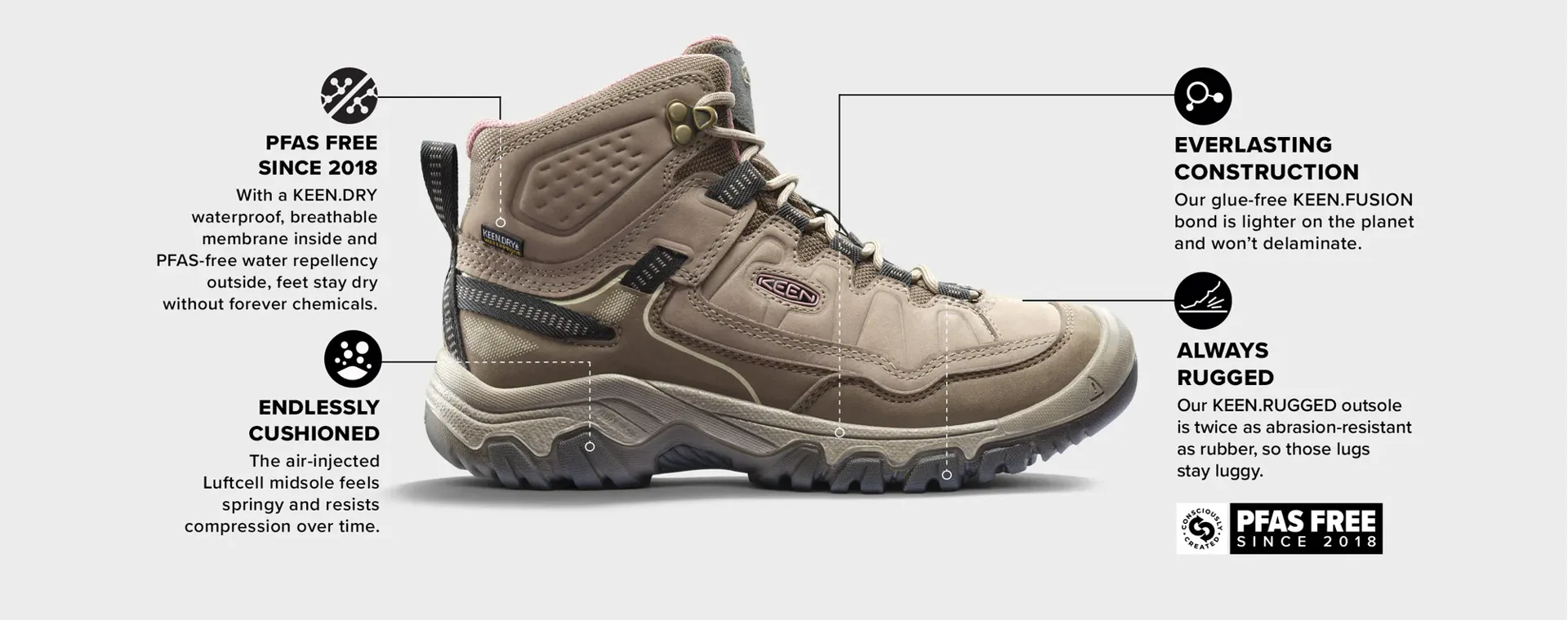 The last hiking boot you’ll buy. Our most durable Targhee yet, now with a glue-free, fused construction that won’t delaminate (Keen guarantee it), plus cushioning that resists compression.