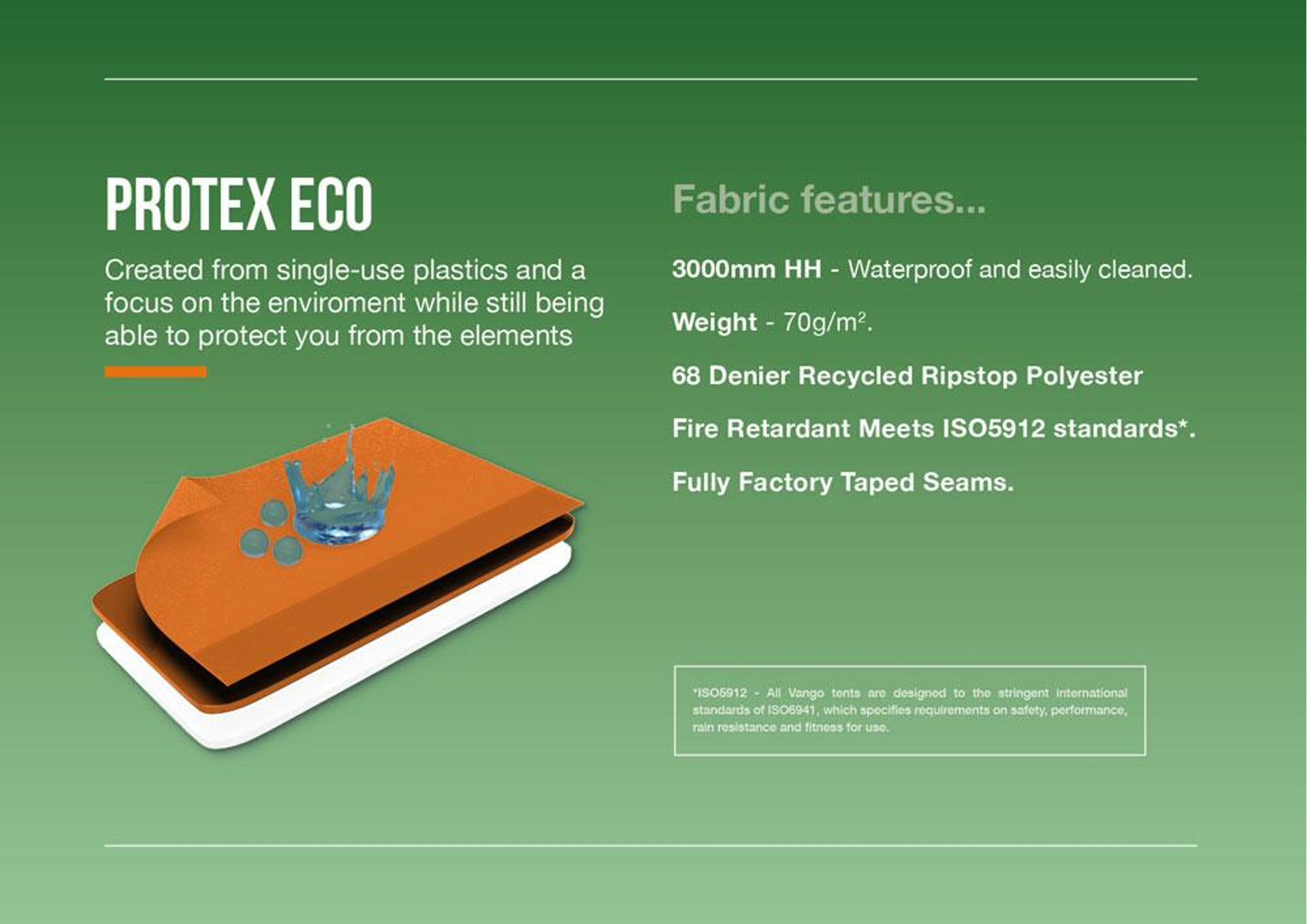 • Protex Eco Flysheet - Created from single-use plastics with a focus on the environment, this 70D polyester is waterproof to 3000mm HH, has fully taped seams, providing durability and reliability for wild camps