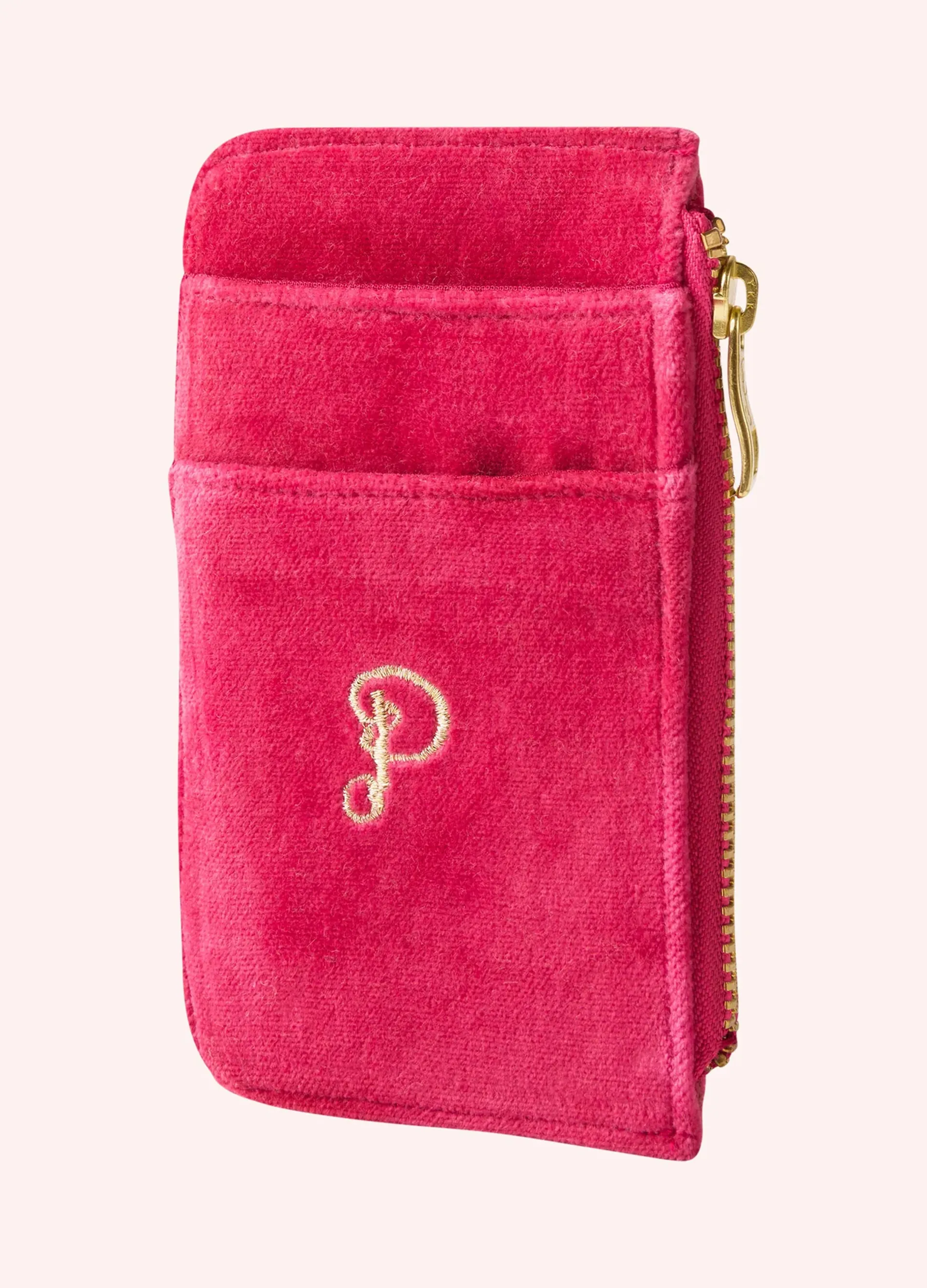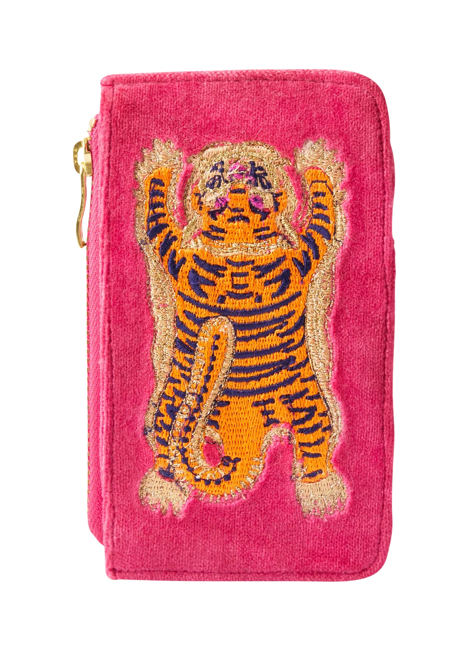 Powder'sikat tiger motif in fuchsia is inspired by regal tapestries and exotic elements. Featuring luxurious hand-embroidery and a decorative tiger friend, this velvet card holder is sure to add practicality and fun into your everyday!